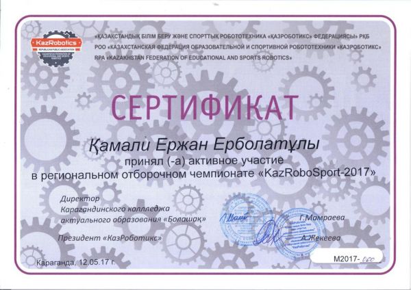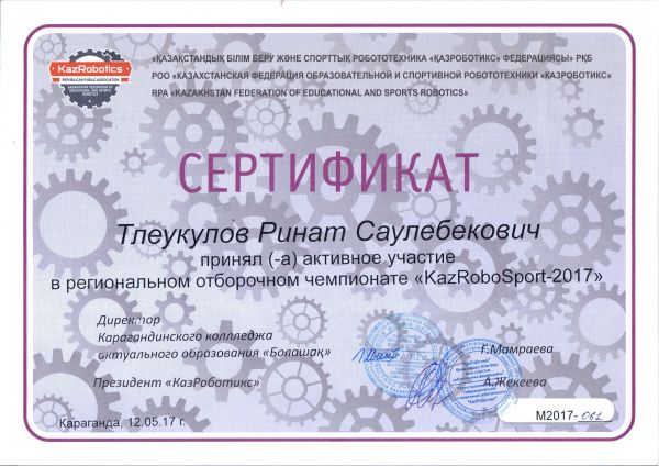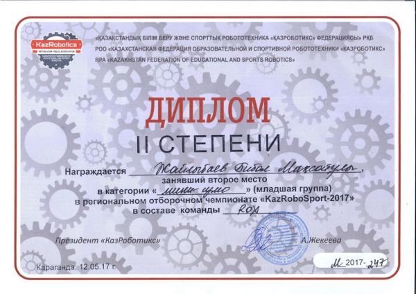 "KazRoboSport-2017" жарысында "Мини сумо" категориясы бойынша Жайлыбаев Бибол, Егінбаев Абзал ІІ дәрежелі дипломға, Тлеукулов Ринат, Камали Ержан сертификатқа  ие болды.