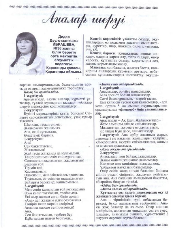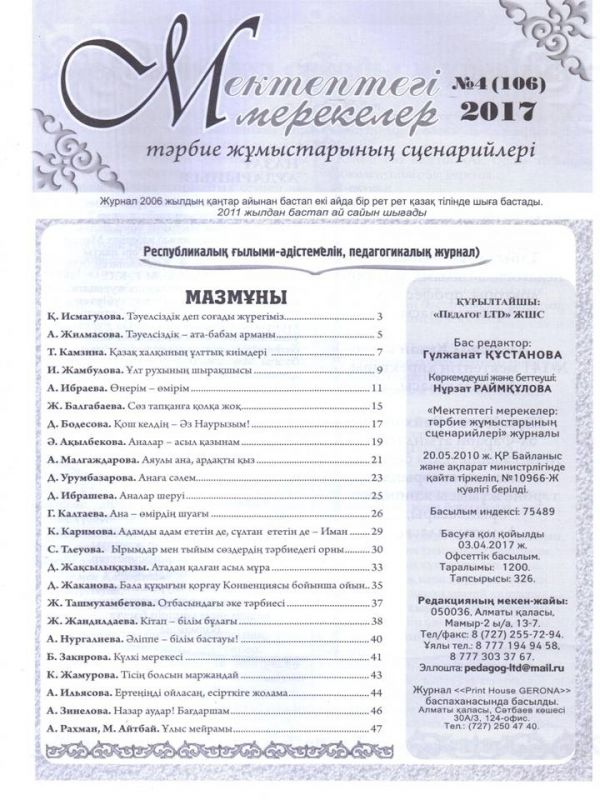 «Мектептегі мерекелер» республикалық  ғылыми-әдісемелік,педагогикалық журналдың 2017 жылы №4 санына мектебіміздің әлеуметтік педагогы Дидар Ибрашова Дәулет…