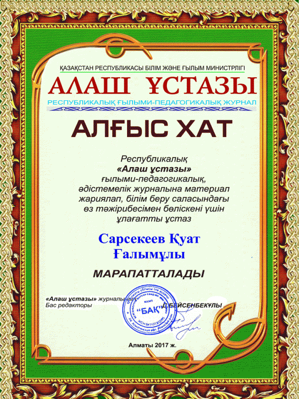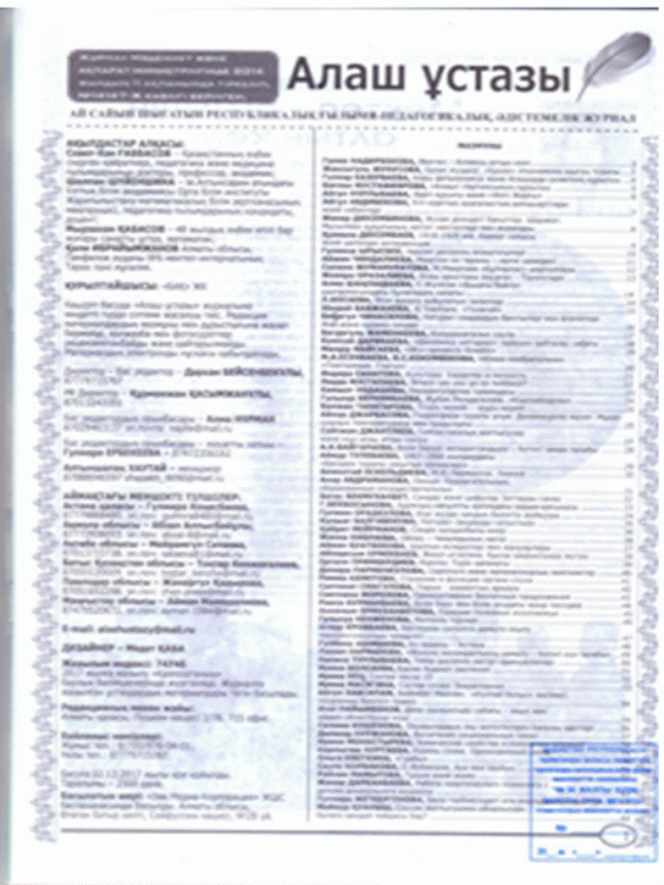 Республикалық ғылыми-педагогикалық,әдістемелік журналының № 2-3 нөміріне №36 ЖББОМ мектебінің тарих пәнінің мұғалімдері Сарсекеев Қуат Ғалымовичтің «Алашорда және Тәу…