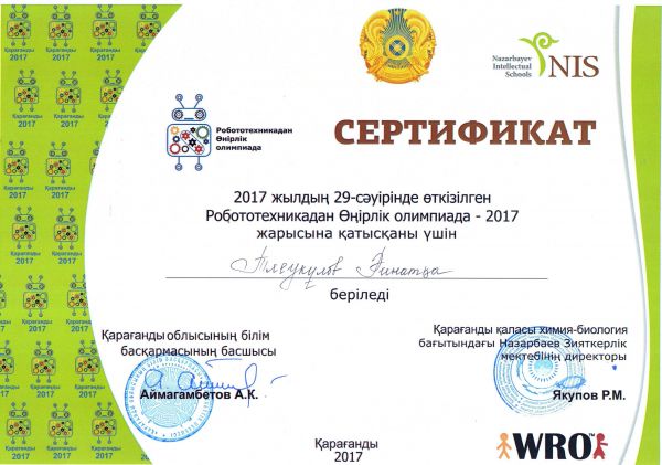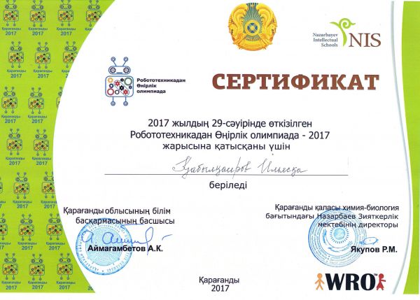 2017 жылдың 29-сәуірінде өткізілген Робототехникадан Өңірлік олимпиада-2017 жарысына қатысқаны үшін Төлеуқұлов Ринат, Қабылқайыров Ильясқа, Камали Ержанға, Алтын Ержанға жене жетекшісі Е.А.Ибраевқа…
