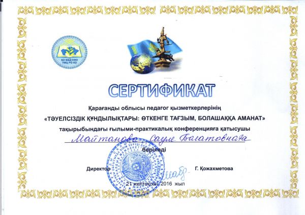 Қарағанды облысы педагог қызметкерлерінің "ТӘУЕЛСІЗДІК ҚҰНДЫЛЫҚТАР: ӨТКЕНГЕ ТАҒЗЫМ, БОЛАШАҚҚА АМАНАТ" тақырыбындағы ғылыми - практикалық конференцияға қатысқаны үшін №36 ЖББ орта мек…