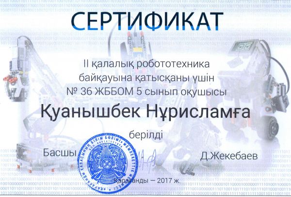ІІ қалалық робототехника байқауына қатысқаны үшін №36 ЖББОМ 5 сынып оқушысы Қуанышбек Нұрислам, 7 сынып оқушысы Қабылқайыров Ілияс, 9 сынып оқушылары Тлеуқұлов Ринат, Камали Ержан сертификатқа ие бо…