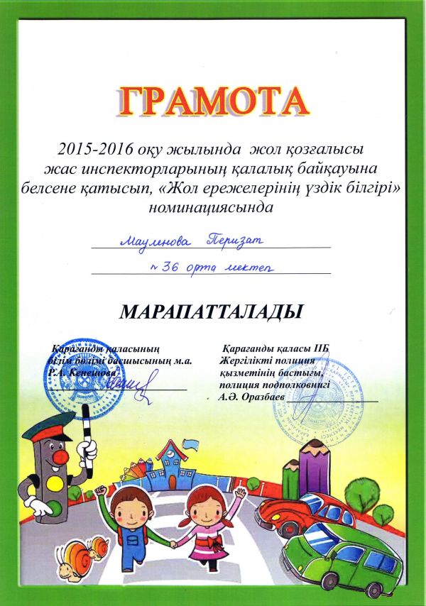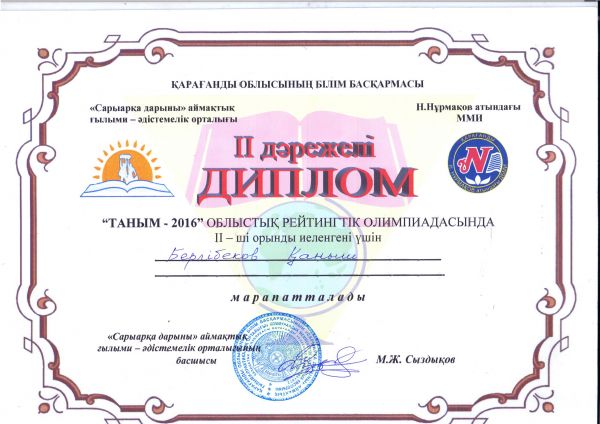 «ТАНЫМ-2016» ОБЛЫСТЫҚ РЕЙТИНГТІК ОЛИМПИАДАСЫНДА ІІ-ШІ ОРЫНДЫ ИЕЛЕНГЕНІ ҮШІН 4 «А» СЫНЫП ОҚУШЫСЫ БЕРЛІБЕКОВ ҚАНЫШ ІІ ДӘ…