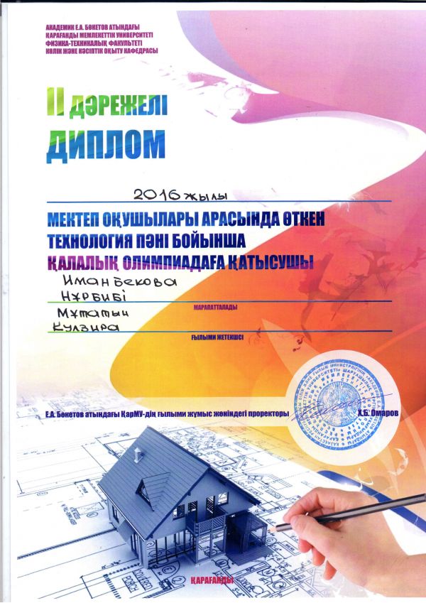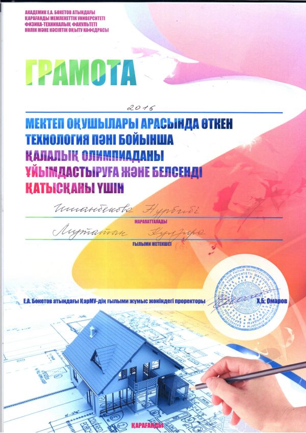 25.02.2016 жылғы  Академик Е.А .Бөкетов атындагы қалалық олимпияда 2 орынға ие болғаны үшін  Иманбекова Нұрбибі және Мұратова Құндыз алғыс хатпен мараппаталды. Жетекшілері : Завйткешова…