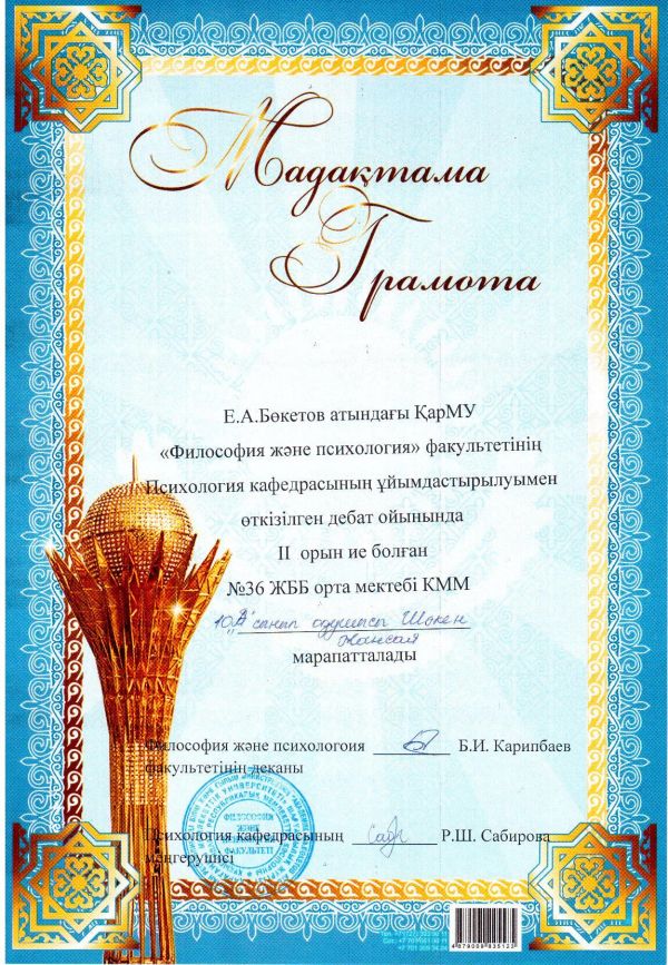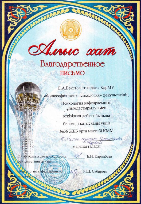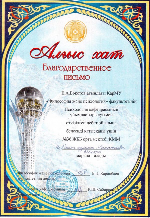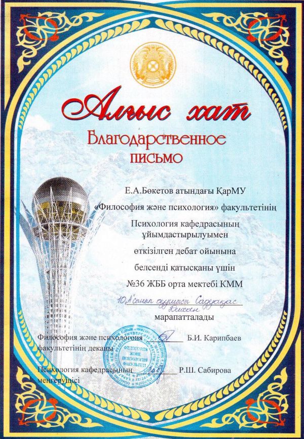 №36 ЖББ орта мектебінде Е.А.Бөкетов атындағы ҚарМУ "Философия және психология" факультетінің Психология кафедрасының ұйымдастыруымен өткен дебат ойынында 10 "Б" сынып оқушы…