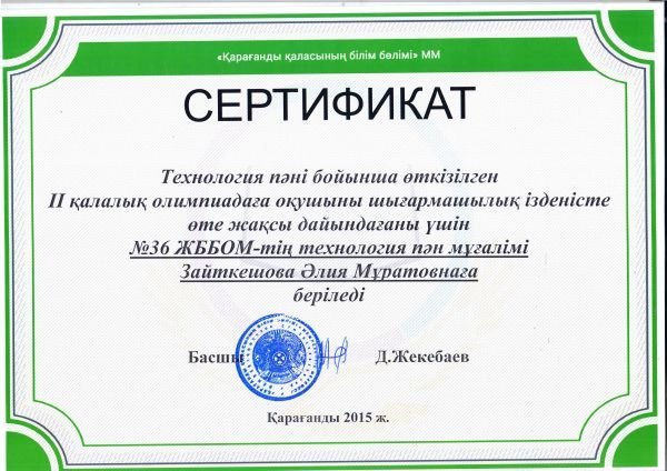 22.12.2015 жылғы Қарағанды қаласының білім бөлімінің ұйымдастыруымен өткен қалалық технология пәнінен өткен олимпиядан 9 «а» сынып оқушысы Спанбетова Арайлым3-оры…