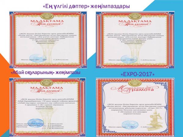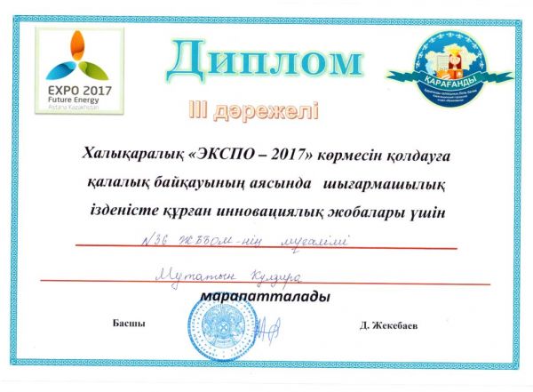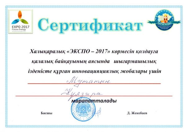 27.11 .2015 ж күні Халықаралық«ЭКСПО-2017»  көрмесін қолдауға қалалық байқауының аясында шығармашылық ізденісте құрған иновациялық жобалары үшін технология пәнінің мұғалімі Мутатын…