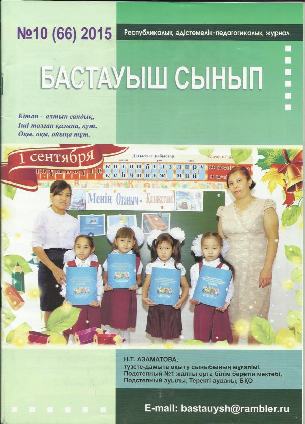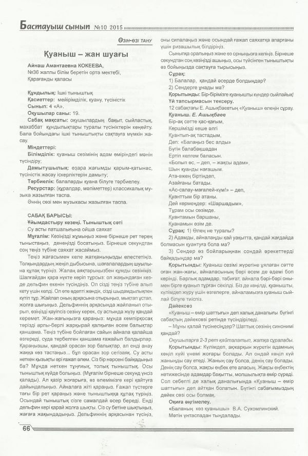 2015 жылдың №10(66) Республикалық әдістемелік педагогикалық  журналға  бастауыш сынып мұғалімі Кокеева Айнаш Амантаевнаның өзін – өзі тану пәнінен «Қуаныш жан шуағы» атты…