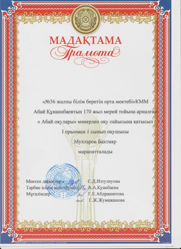 23.11 – 04.12.2015ж. аралығында өткен бастауыш сынып апталығында «Абай оқулары» атты мәнерлеп оқу сайысынан 1 «А» сынып оқушысы  Мухтаров Бахтияр І орынға ие болды…