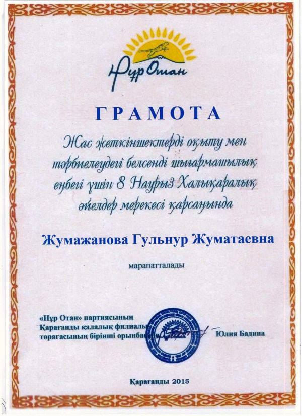 8 Наурыз Халықаралық әйелдер мерекесі қарсаңында жас жеткіншектерді оқыту мен тәрбиелеудегі шығармашылық еңбегі үшін кәсіподақ ұйымы мен Нұр Отан партиясы атынан Жумажанова Гульнур Жуматаевна марапа…