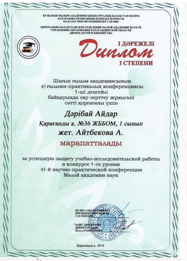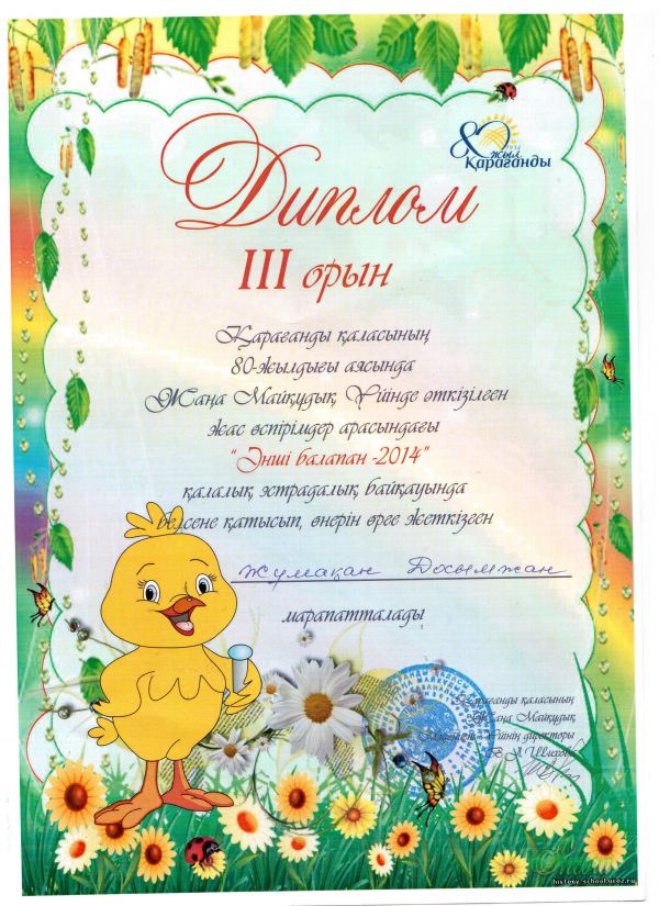 Қарағанды қаласының 80 жылдығына орай өткен жас өспірімдер арасындағы «Әнші балапан» қалалық конкурсына қатысып 2 «А» сынып оқушысы Жумакан Досымжан 3 орынмен мар…