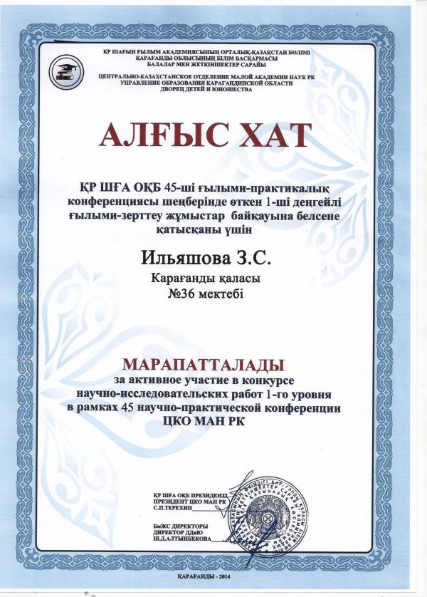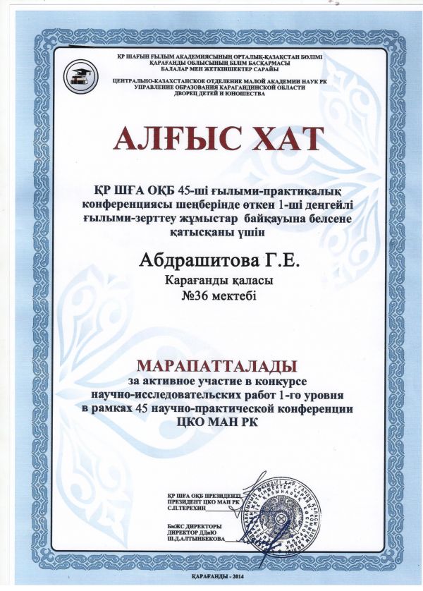 Оқушылар арасындағы география пәнінен Облыстық олимпиадаға қатысқаны үшін Маратов Алдияр СЕРТИФИКАТҚА ие болды.