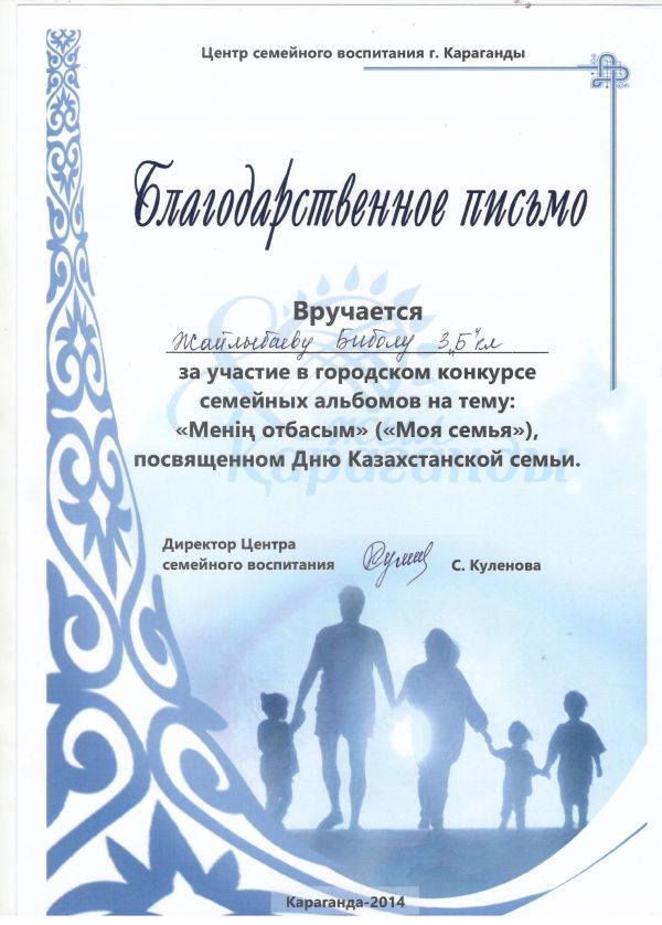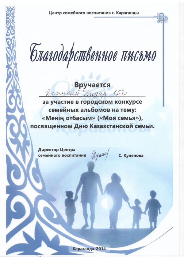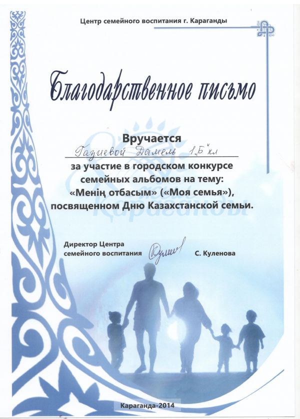 В начальных классах родители участвовали в городском конкурсе на тему "Моя семья" посвященной Дню Казахстанской семье. И всем родителям было вручено "Благодарственное письмо".