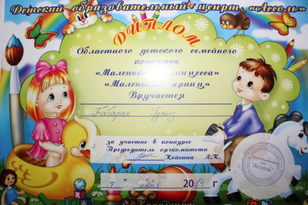 Мектеп алды даярлық тобының бүлдіршіні Табарак Гүлназ "Кішкентай ханшайым" отбасылық байқауына қатысып, дипломмен марапатталды.