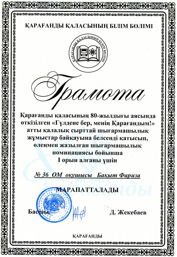 Қарағанды қаласының 80 -жылдығы аясында өткізілген "Гүлдене  бер, менің Қарағандым!" атты қалалық сырттай шығармашылық жұмыстар байқауына белсенді қатысып, өлеңмен жазылған шығармашыл…