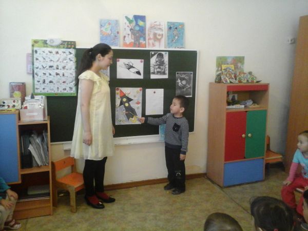 Тақырыбы: Ғарыш әлеміне саяхат. Мақсаты: Ғарыш әлемі туралы түсініктер беру. Аспан әлемі ғарыш,  ғарыш айлағы - Байқоңыр туралы білім беру. Елестету қиялын дамыту. Ойлау қабілеттерін дамыту.