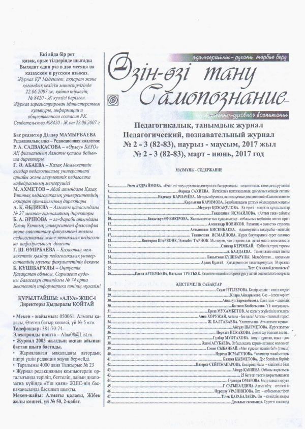 "Өзін - өзі тану " журналына №36 жалпы білім беретін мектеп директоры С.Д. Изтулеуованың 8-сыныпқа арналған "Кешірімділік - көңіл кеңдігі" және 5-сыныпқа арналға…