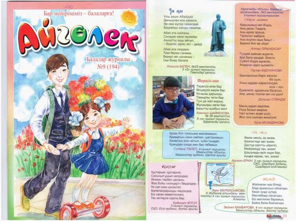 №36 жалпы білім беретін орта мектебінің 5- сыныбының оқушылары Жұмақан Досымжанның «Айгөлек» журналына «Тәуелсіз елім» және Шайкенова Амангүлдің «Балдырған» журна…