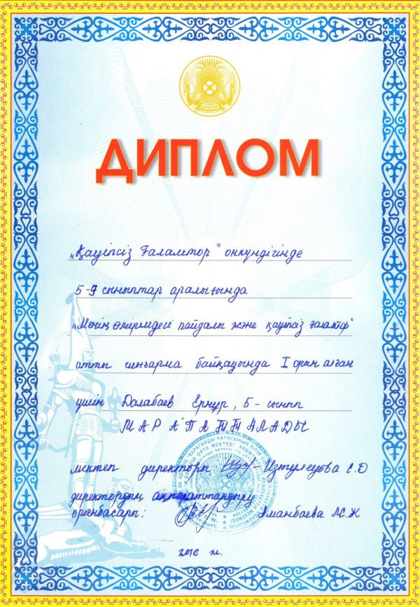 Ученица 2 класса Жакина Куралай отмечена сертификатом за участие во Всероссийском турнире "Зеленая математика-2015/2016".