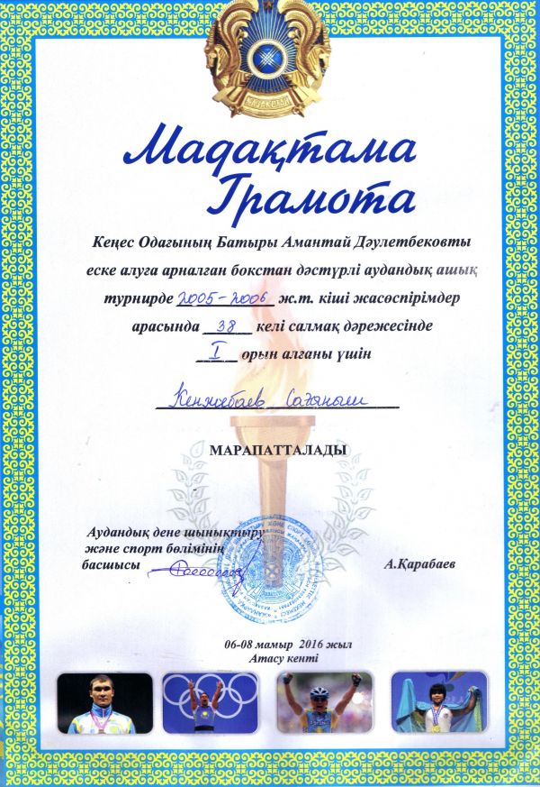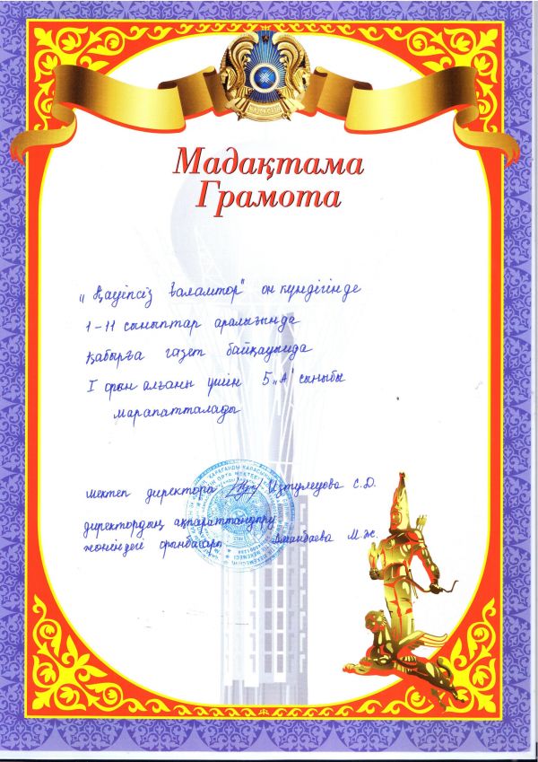 Учащийся 5 «А» класса Кенжебаев Сағыныш был награжден грамотой за занятое І место по боксу в областных и городских соревнованиях. Его одноклассник Адилхан Кунтуган награжден грамотой за…