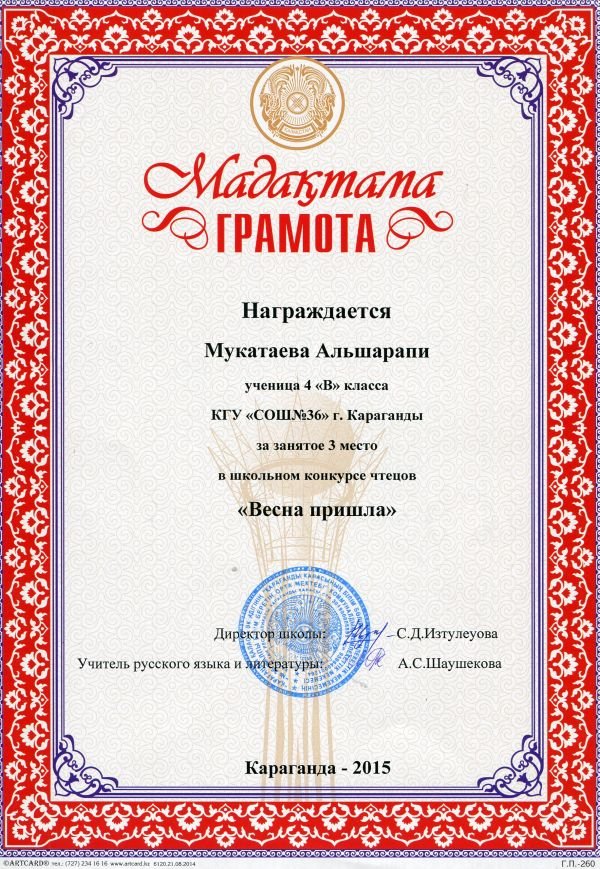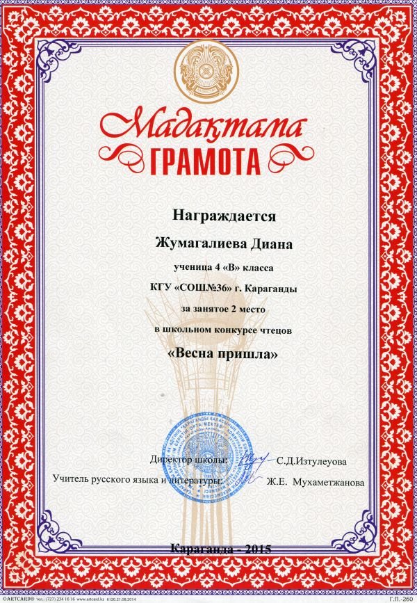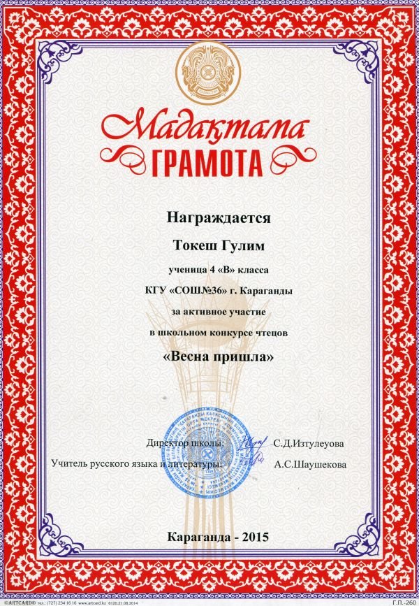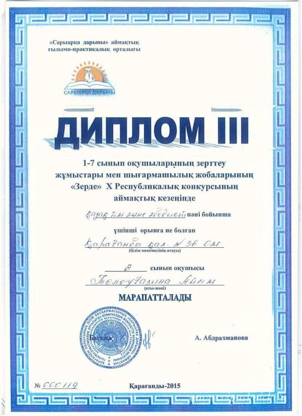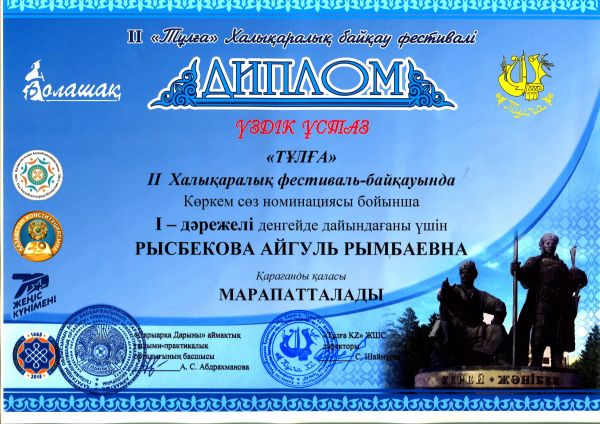 конкурсынан Жумагалиева Диана I орын, Мукатаева Альшарапи III орын,қатысқаны үшін Токиш Гулим марапа…