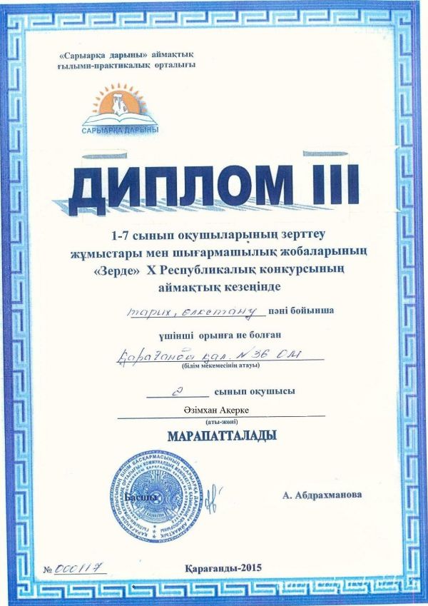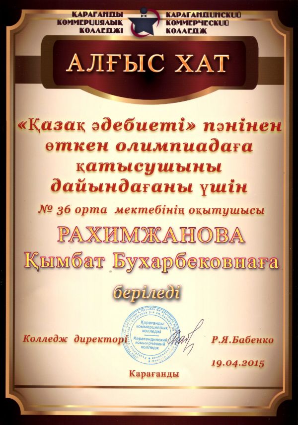 Қазақ әдебиеті пәнінен Қарағанды коммерциялық колледжі өткізген мектеп бітірушілері арасындағы облыстық олимпиадаға 9 «А» сынып оқушысы Шәкен Жансая қат…