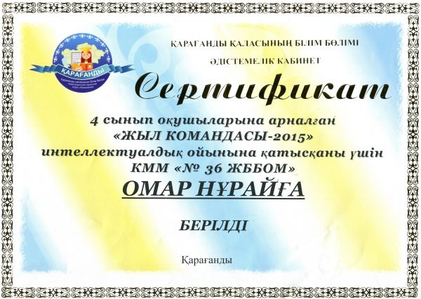4 сынып оқушыларына арналған «Жыл командасы-2015» интеллектуалдық ойынына қатысып, 4 «в» сынып оқушысы Омар Нұрай сертификат иеленді.