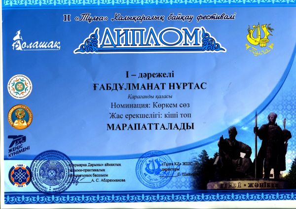 1 «В» сынып оқушысы Ғабдұлманат Нұртас II «Тұлға» Халықаралық байқау фестивалінен I- дәрежелі жүлдемен оралды. Көркем сөз номинациясымен марапатталды.