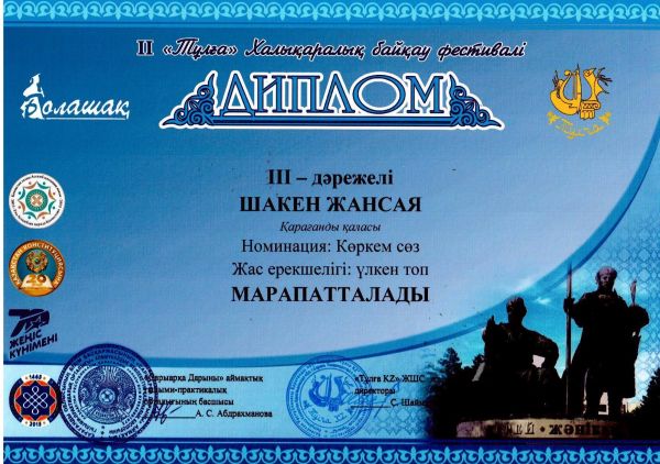 ІІ Халықаралық «Тұлға» фестиваль-байқауында көркем сөз номинациясы бойынша Шәкен Жансая ІІІ дәрежелі дипломмен марапатталды.