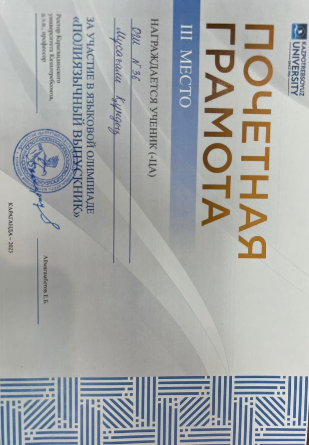 Қарағанды қаласы жоғарғы Қазтұтынуодағы университеті  Экономика, басқару мен кәсіпкерлік факультеті ұйымдастырған көптілділікке арналған облыстық олимпиядаға мектеп түлектері Мұсағали Құндыз бе…