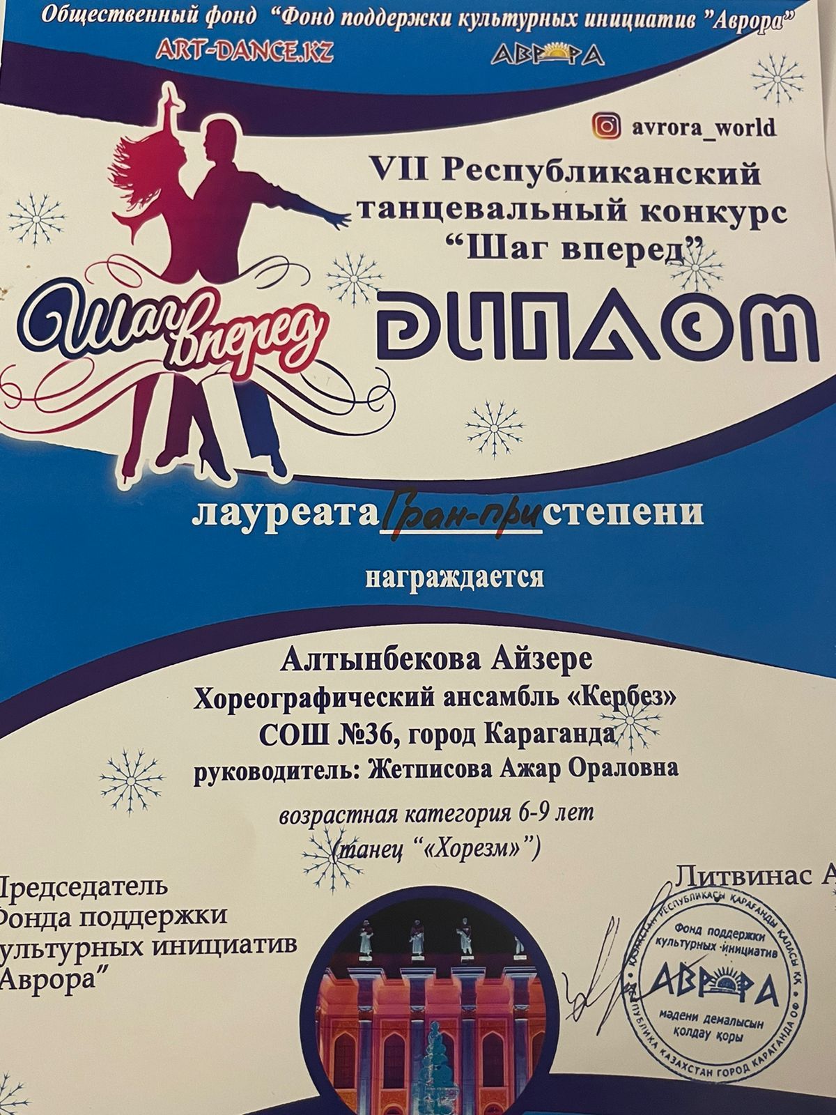 Құттықтаймыз!!! VII Республикалық "Шаг вперед" би байқауында "Кербез" би ансамблінің мүшесі Алтынбекова Айзере Бас жүлдені иеленді