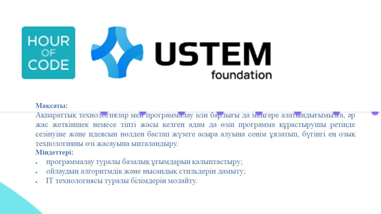 4 - 8 желтоқсан аралығында  оқушылардың  ІТ саласындағы инновациялық құзыреттілікті дамыту, танымдық қызығушылықты қалыптастыру мақсатында Халықаралық "Компьютерлік ғылымдар апталығы&…