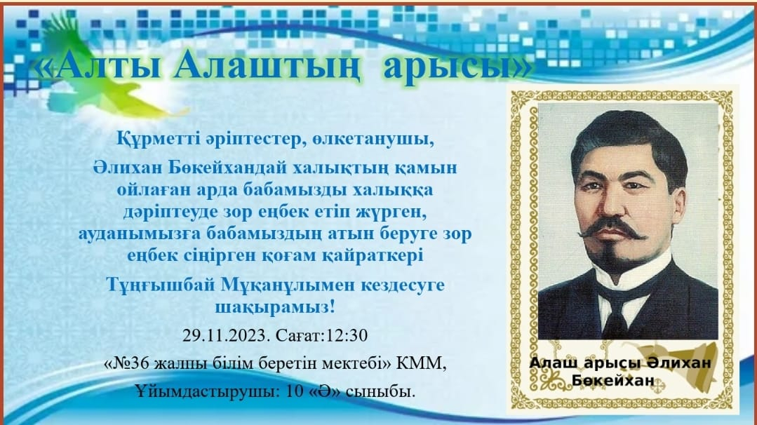 Құрметті ұстаздар, ата-аналар, оқушылар, сіздерді 29.11.2023ж. сағ:12:30 «Әлихан – алты Алаштың арысы» атты әдеби-тарихи кешке шақырамыз!