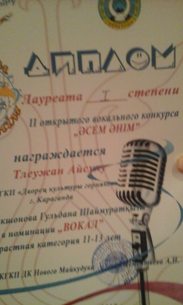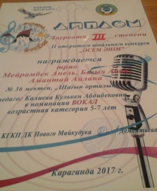 22 қазан Майқұдық Мәдениет сарайында өткен «Әсем әнім» атты екінші ашық вокалдық конкурста №36 мектеп оқушылары 7 сыныпТлеужан Айсұлу 1 дәрежедегі диплом, 8 сыныпЖеніс Нұрасыл 2дәрежедег…