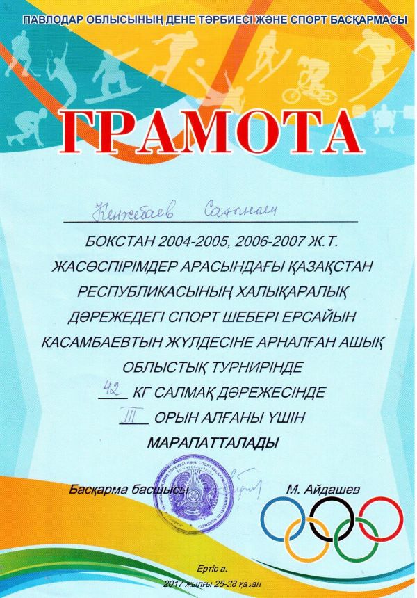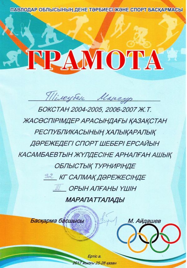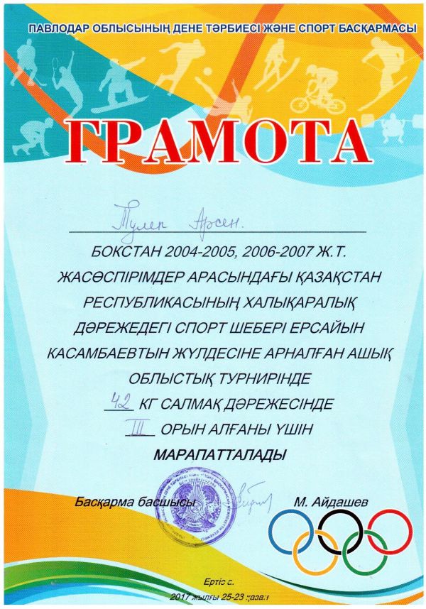 Бокстан 2004-2005, 2006-2007 ж.т жасөспірімдер арасындағы Қазақстан Республикасының  Халықаралық дәрежедегі спорт шебері Ерсайын Касымбековтың жүлдесіне арналған ашық облыстық турнирінде І орын…