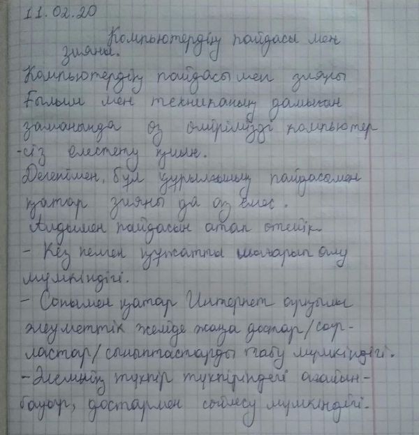 6"Ә" -сыныпта қашықтан "Компьютердің пайдасы мен зияны" атты тақырыпта сынып сағаты өтті. Көрсетілген презентация төңірігінде сұхбат болды. Өз түсінгендерін қағаз бетіне жазды. Қазіргі таңда күндіз-тү…