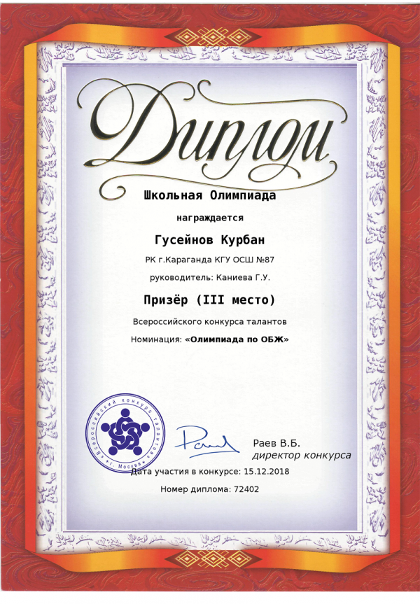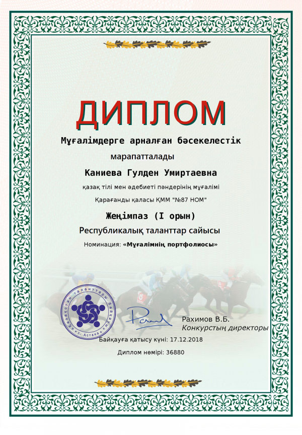 Казақ тілі мұғалімі Каниева Гулден Умиртаевна қашықтықтан өткізілген Республикалық таланттар сайысына қатысып, екі байқаудан жүлделі 1-орын алды