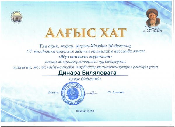 Ұлы ақын, жырау, жыршы Жамбыл Жабаевтің 175 жылдығына арналған мектеп оқушылары арасында өткен «Жүз жасаған жүректен» атты облыстық мәнерлеп оқу байқауына…