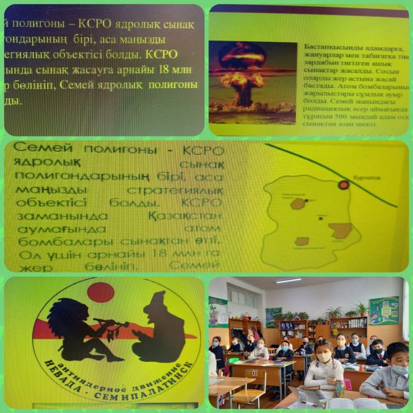 1"Ә" сыныбында Семей полигонының жабылуына 30 жыл толуына байланысты сынып сағаты өтті.Балаларға дацындалған мәліметтер көрсетілді.