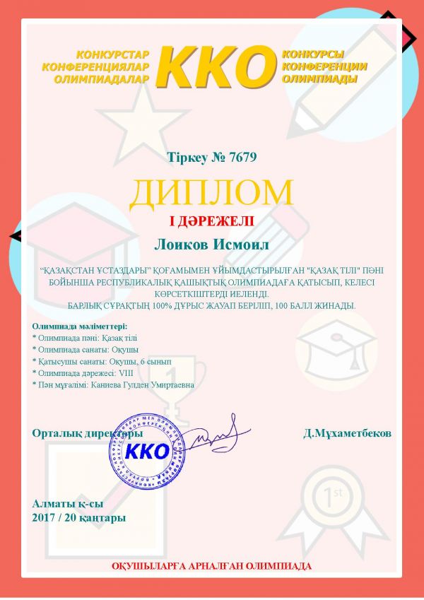 4 "А" , 6 "А" сынып оқушылары қазақ тілі пәнінен республикалық қашықтық олимпиадасына қатысып, жүлделі орындарға ие болды. Жетекші мұғалімге алғыс хат берілді.