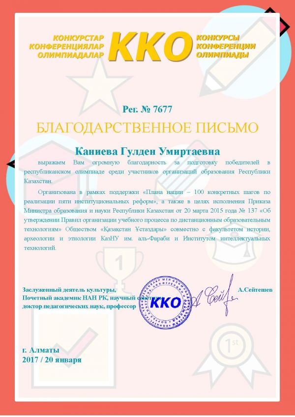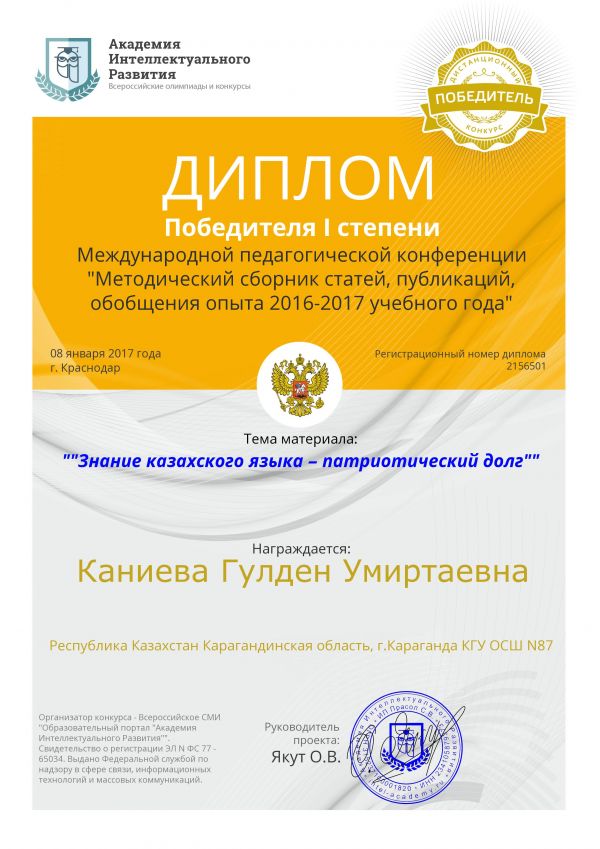 Қазақ тілі мен әдебиет пәндерінің мұғалімі Каниева Гулден Умиртаевна "2016-2017 оқу жылындағы тәжірибе алмасу мақсатындағы әдістемелік жинақ" атты Халықаралық ғылыми-тәжірибелік…