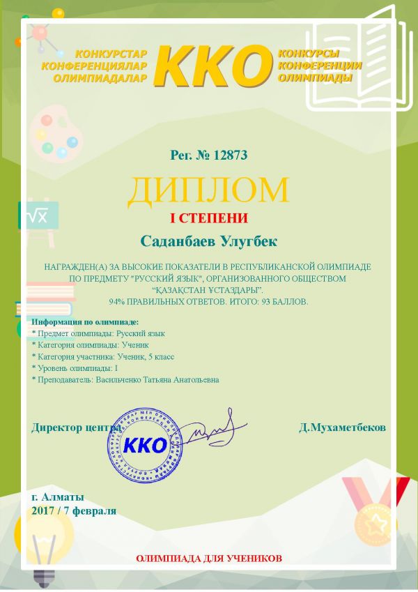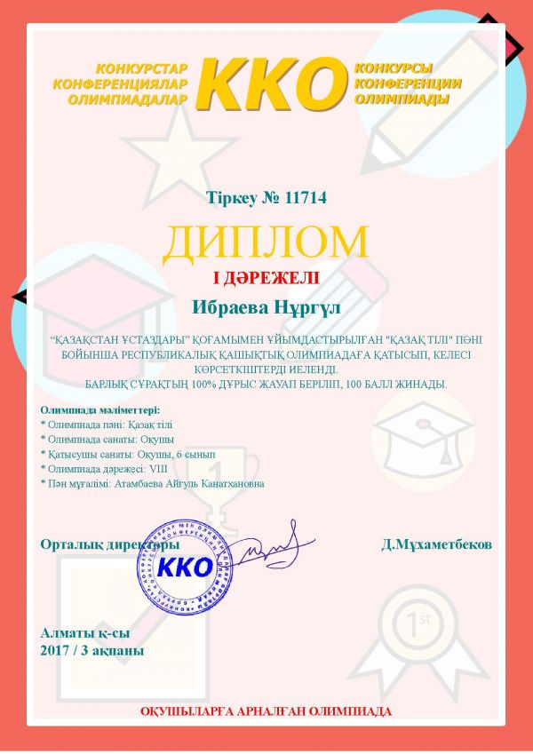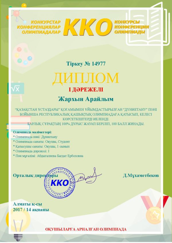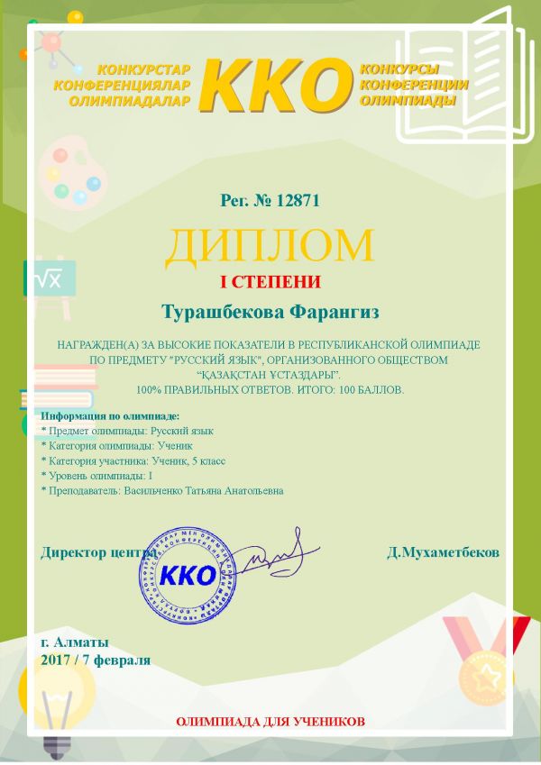 Учитель начальных классов Абдыгалиева Багдат Ерболовна заняла 1-место в республиканской дистанционной олимпиаде!