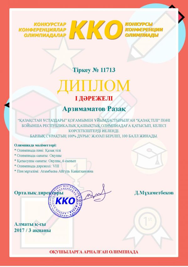 Ученики 5 Ә, 6Ә, 7Ә классов активно участвовали в республиканской олимпиаде по казахскому языку и заняли призовые места. Учитель - Атамбаева Айгул Канатхановна