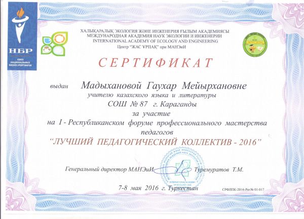 Мамырдың 7-8 күндері Түркістан қаласында өткен «Халықаралық экология және инженерия» ғылым академиясының ұйымдастыруымен «Ең үздік педагогикалық ұжым- 2016».