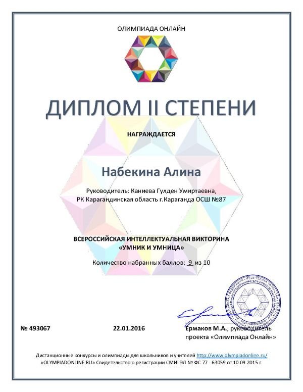 Каниева Гулден Умиртаевна активно участвовала в дистанционной интеллектуальной викторине "The main parts of London" , набрала 7 баллов из 10, и получила сертификат!!!