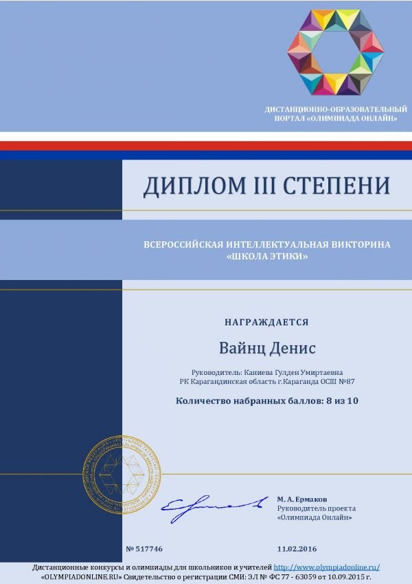 Учащиеся 5-7 классов участвовали в дистанционной олимпиаде "Школа этики", и заняли призовые места. Руководитель: Каниева Гулден Умиртаевна