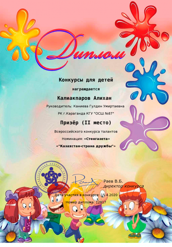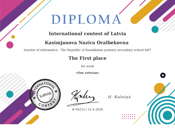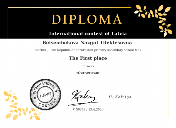 Қазақ тілі мен әдебиет пәні мұғалімі Каниева Г.У. «Ұлы Отан соғысы» атты жұмысымен Халықаралық қашықтықтан өткен байқауға қатысып, дипломмен марапатталды