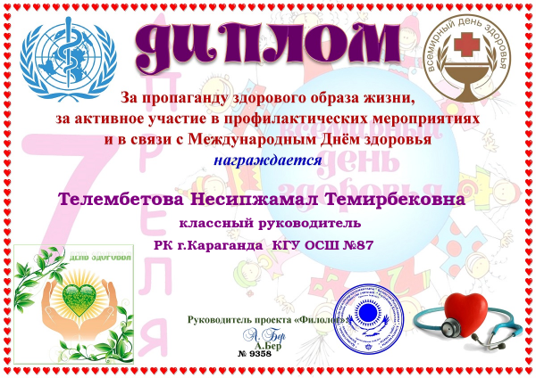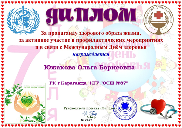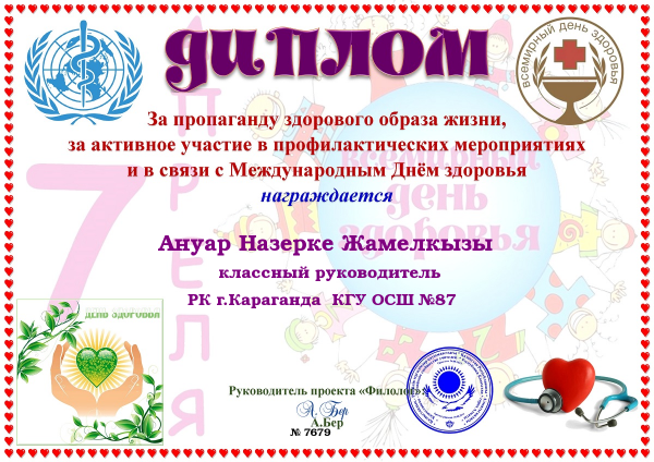 В рамках проекта ШСУЗ награждаются члены проекта за пропаганду здорового образа жизни, за активное участие в профилактических мероприятиях и в связи с Международным днем здоровья. Координатор Каниев…