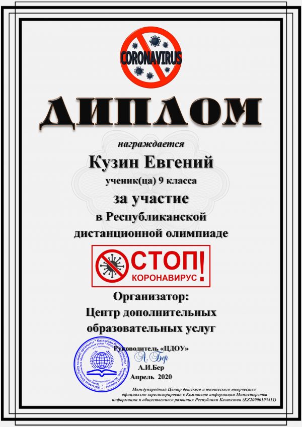 В рамках проекта ШСУЗ учащиеся 9 «А» класса участвовали в республиканской дистанционной олимпиаде «Стоп коронавирус!» и получили дипломы! Координатор проекта Каниева Г.У.