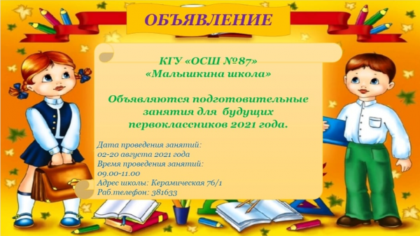 2021 жылдың болашақ бірінші сынып оқушыларына дайындық сабақтары өтетінін хабарлайды.
